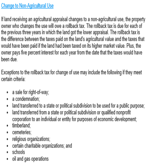 **For more information provided by the Comptrollers Office on Agricultural, Timberland AND Wildlife Management Use – SPECIAL APPRAISAL: Click Here